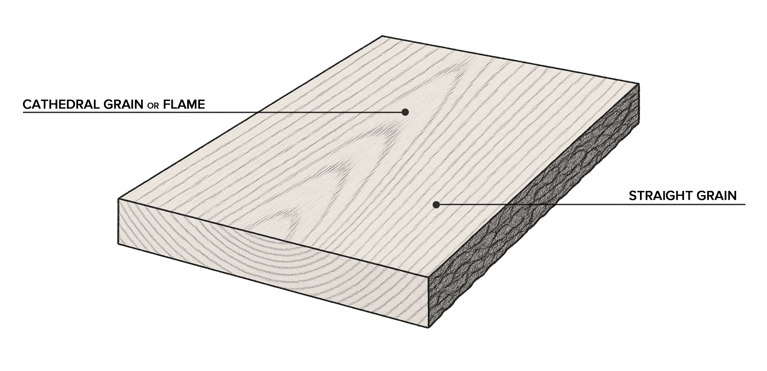 Big, arching patterns that look like flames or gothic windows. Found in live-sawn and flat-sawn boards. Loud, organic, and full of character, they’re great for showpiece tables or doors.